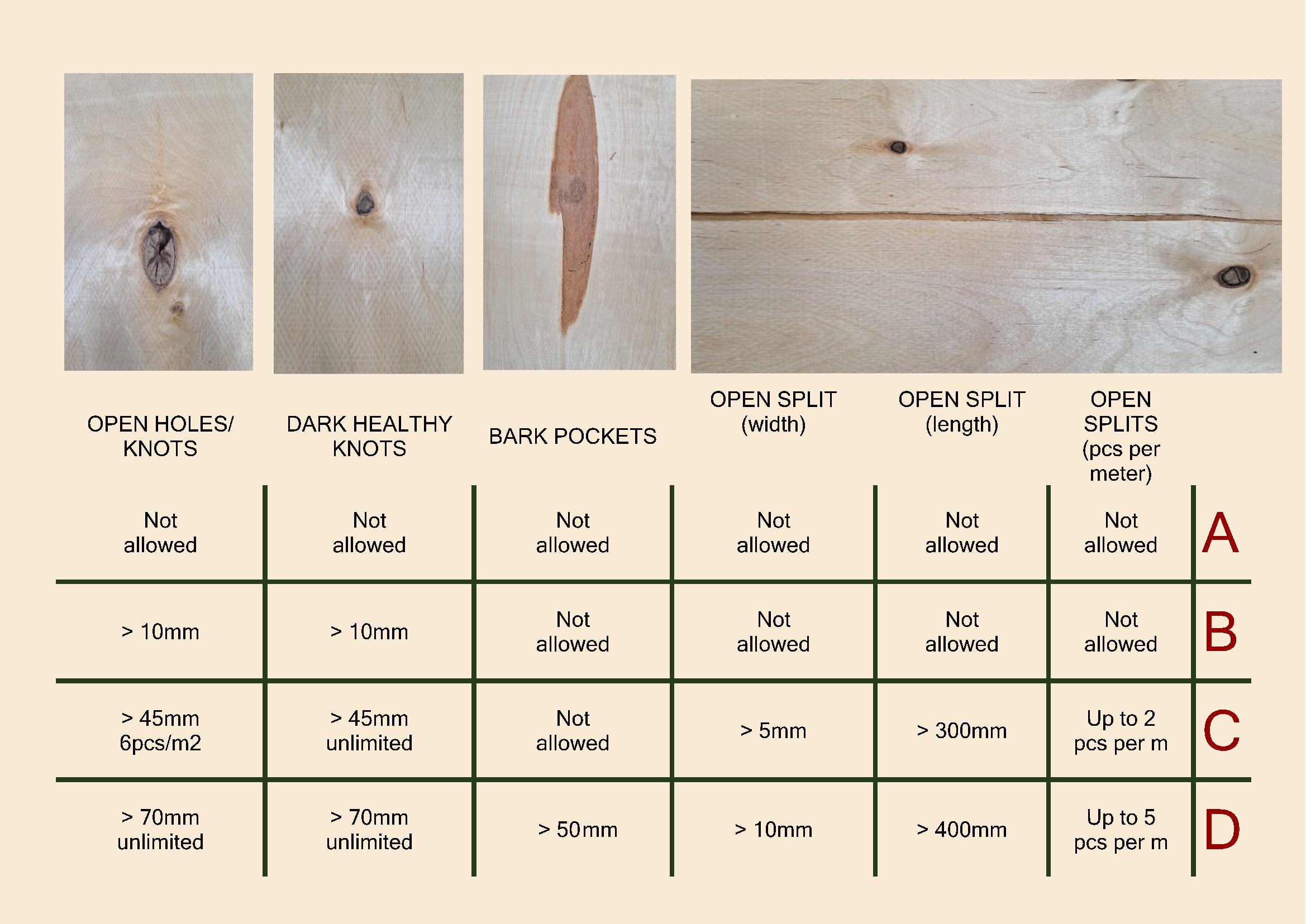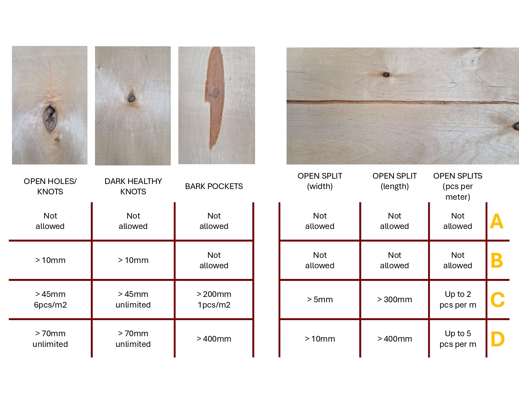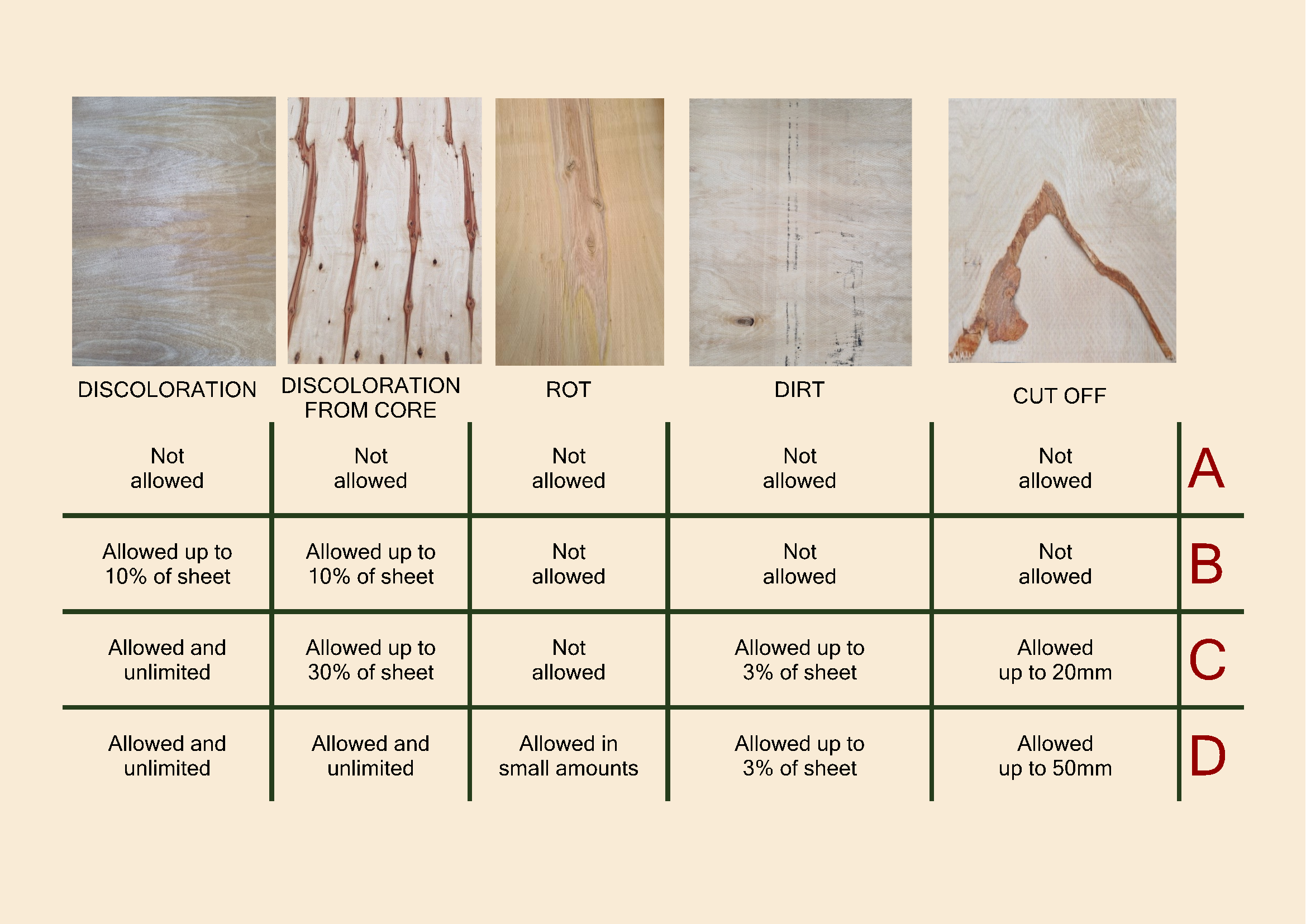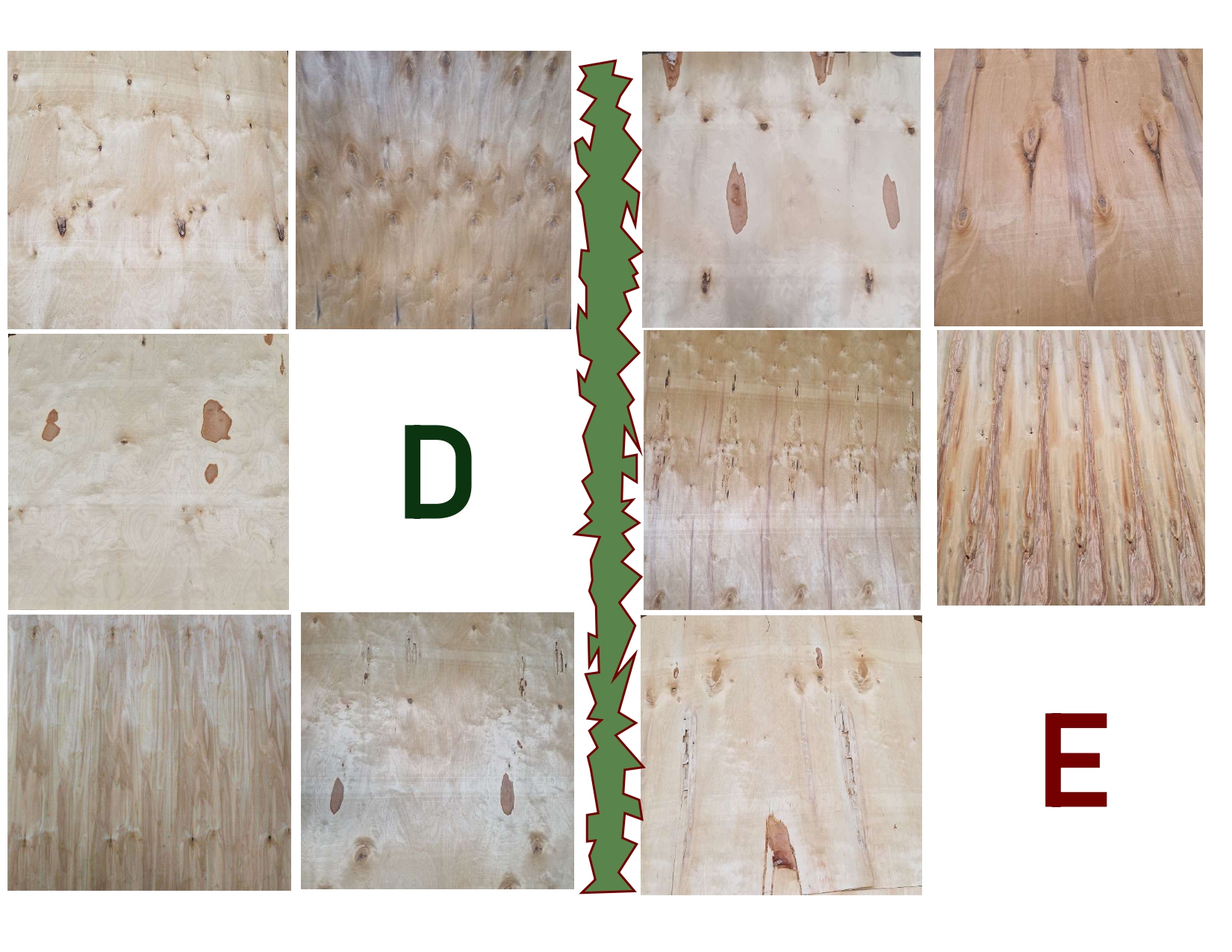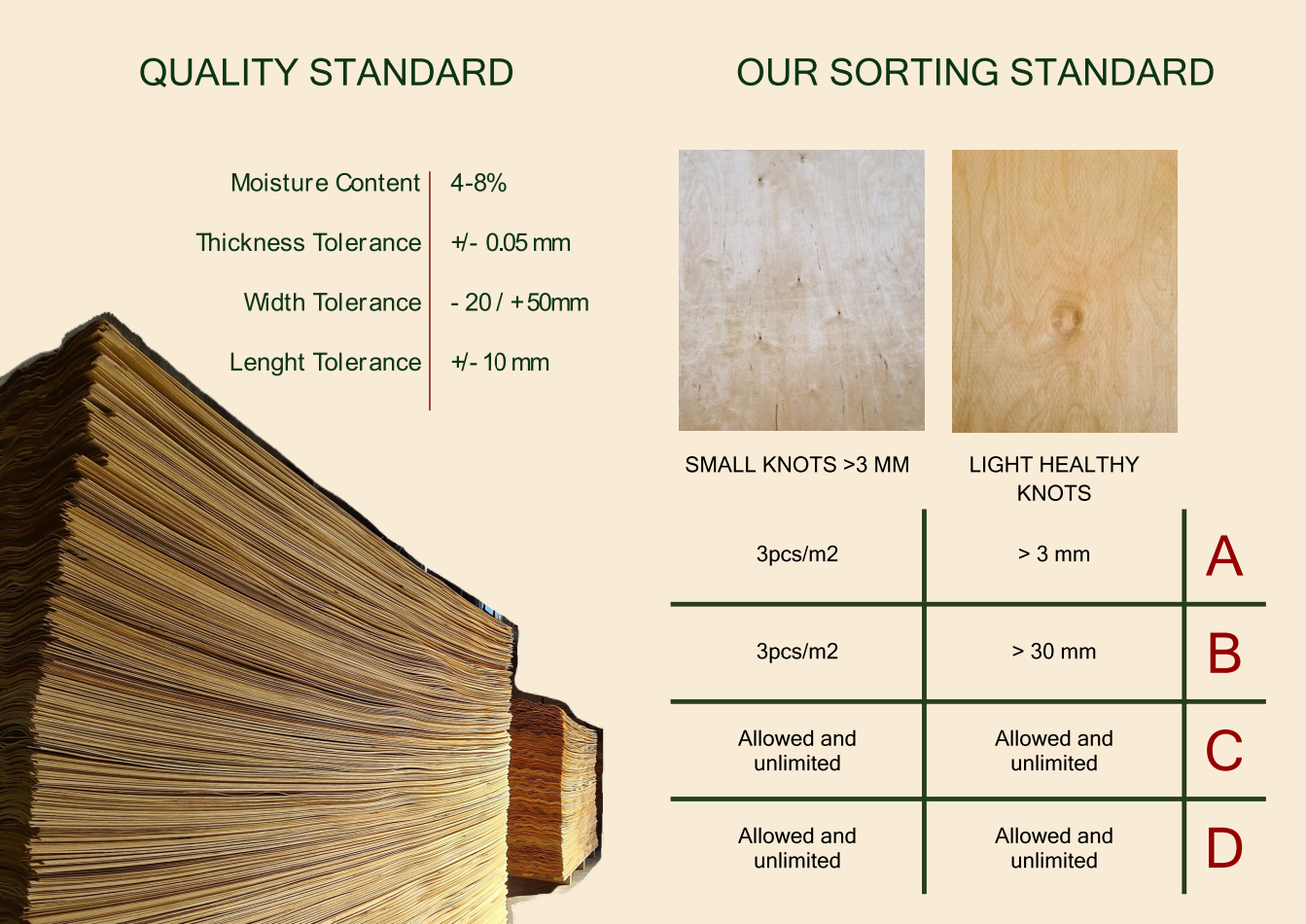 Standard thickness is 1.5mm, non-standard thickness in range 1.0-3.0mm. The veneer is available in ABCD and E grade packs.